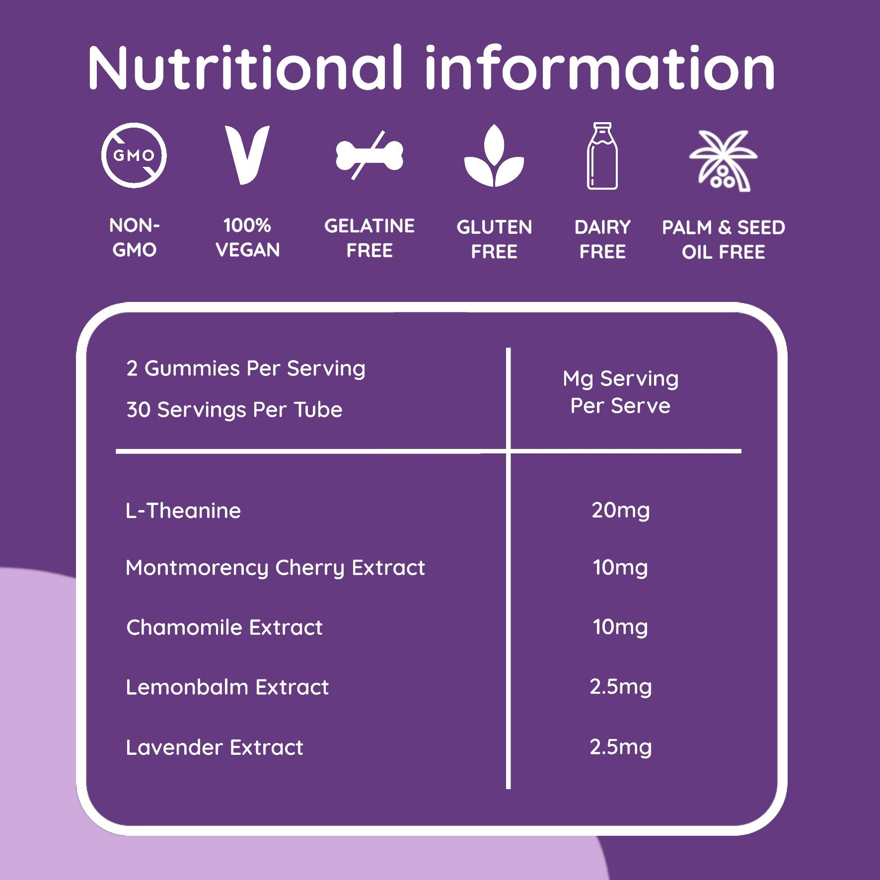 Escape the chaos of your day and drift into dreamland with gmys Relaxation Sleep Gummies. Our berry-flavoured gummies are expertly crafted with L-Theanine, Lavender Extract, and Montmorency Tart Cherry — a natural source of melatonin. Thoughtfully balanced to help you unwind, fall asleep faster, and wake up feeling refreshed.